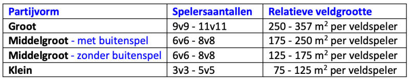 In principe is dit ook logisch, want tijdens de partijvormen en positiespelen willen we het liefst situaties terugzien die ook kunnen voorkomen tijdens de wedstrijden. Dus zullen de relatieve veldgroottes die we hanteren tijdens de verschillende partijvormen niet te veel mogen afwijken van de relatieve veldgroottes die tijdens wedstrijden worden gehanteerd. En dus kunnen we de veldgrootte waarin we een partijvorm spelen niet los zien van de spelersaantallen die aan dat partijspel meedoen. Vandaar ook de eerder besproken indeling van partijvormen (zie ook blog 19 en blog 20) …